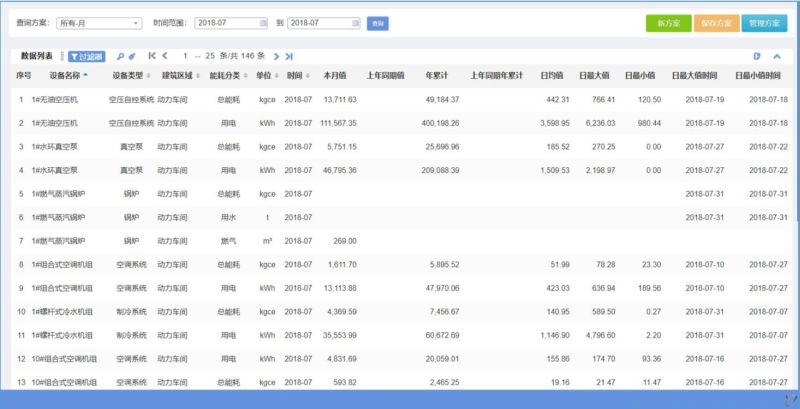 功能介绍:此功能主要满足用户对设备的历史能耗进行多角度查询的需要,允许用户自行定制查询条件,并支持自定义查询方案的编辑,手动录入和自动计算的数据都在查询的范围之内。